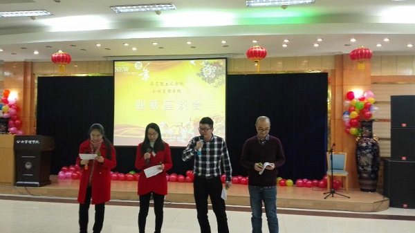 和公共管理学院的领导和教职工欢聚一堂,召开迎新晚会,晚会由李佳和李雪松主持。