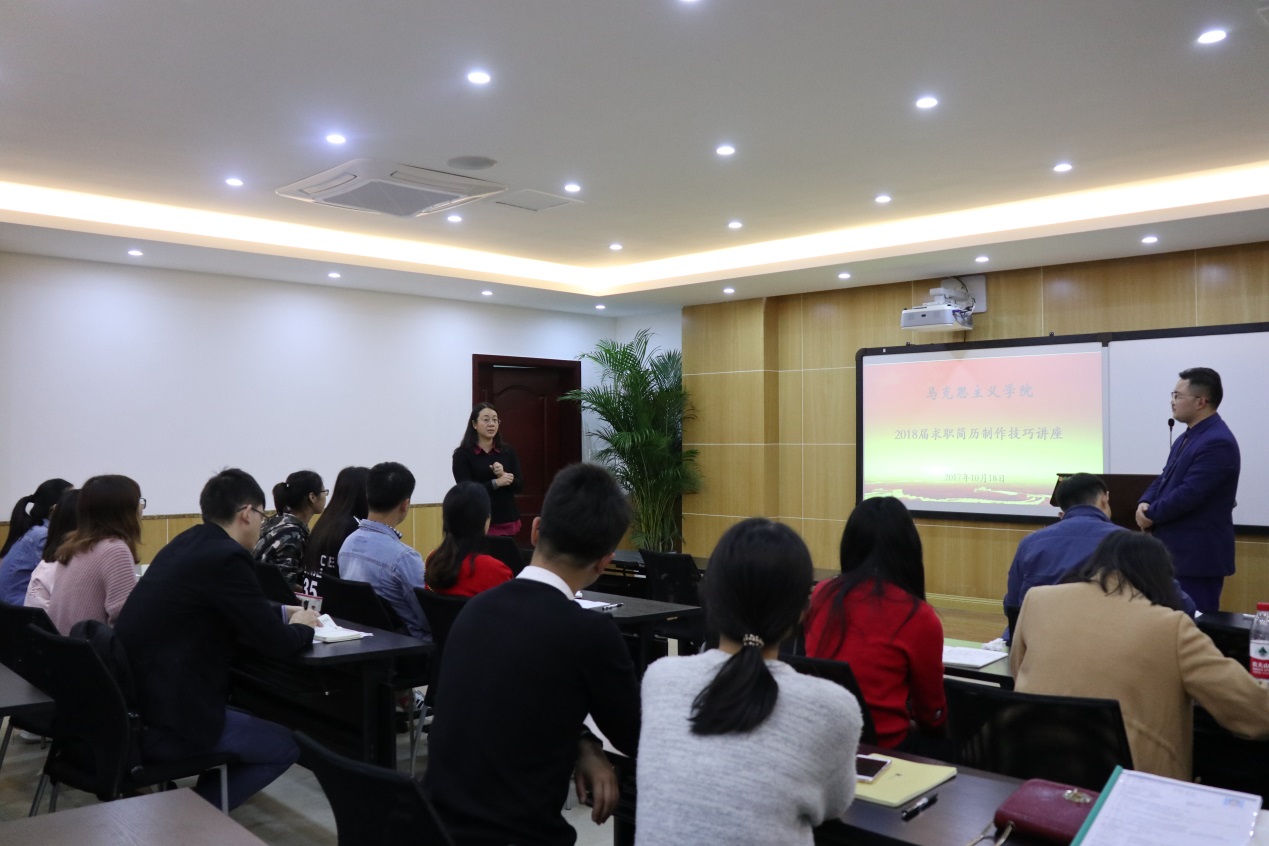 邀请企业管理高级咨询师王麒凯在学院412教室顺利举行2018届毕业研究生求职简历制作技巧讲座。学院党委副书记(主持工作)罗滌出席本次会议,2018届全体毕业研究生参加了本次培训。