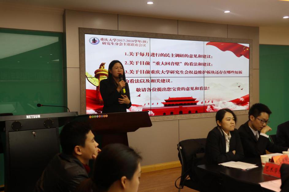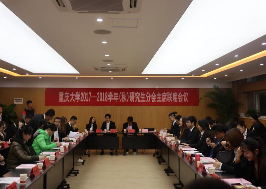 为学习贯彻党的十九大精神,切实推动校园民主,促进校、院两级组织共同发展,强化各级研究生会“自我教育、自我管理、自我服务、自我监督”的职能,2017年11月28日重庆大学2017-2018学年(秋)研究生分会主席联席会议在色花堂