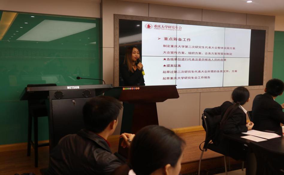 第二项,校研会主要干部通报相关工作。首先,校研会常务副主席钟晓阳汇报重庆大学研究生会2017-2018年(秋)工作规划;其次,校研会常务副主席贾鑫主要通报了关于筹备好重庆大学第二次研究生代表大会的工作安排;最后研究生会文艺部部长廖骏豪通报了关于做好重庆大学2018年研究生元旦晚会的安排。