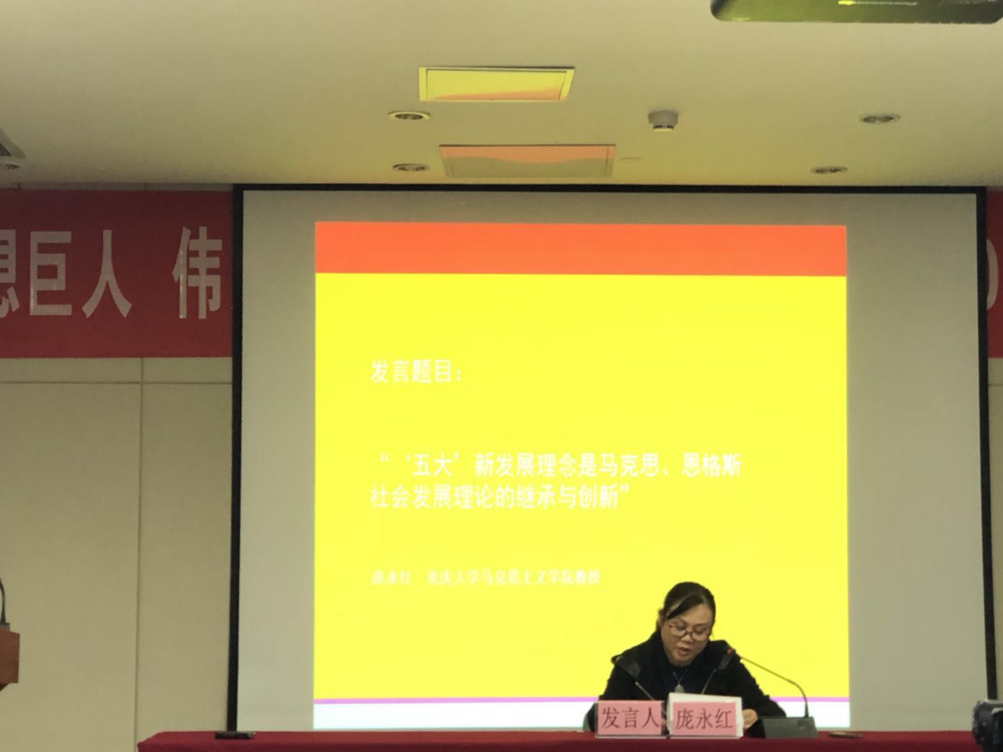 庞永红教授的大会主题发言为《‘五大’新发展理念是马克思、恩格斯社会发展理论的继承与创新》。庞教授在发言中指出,以习近平同志为核心的党中央提出的“创新、协调、绿色、开放、共享”五大新发展理念,从内容到本质都充分体现了马克思、恩格斯社会发展理论的深刻内涵,让我们更加全面、准确地理解当今中国的发展;是用马克思主义的基本立场、观点研究中国现实重大问题;是对马克思、恩格斯社会发展动力理论、有机体理论、历史合力论、生态思想、全球化理论、东方社会发展思想以及社会发展价值理论等的继承与创新。