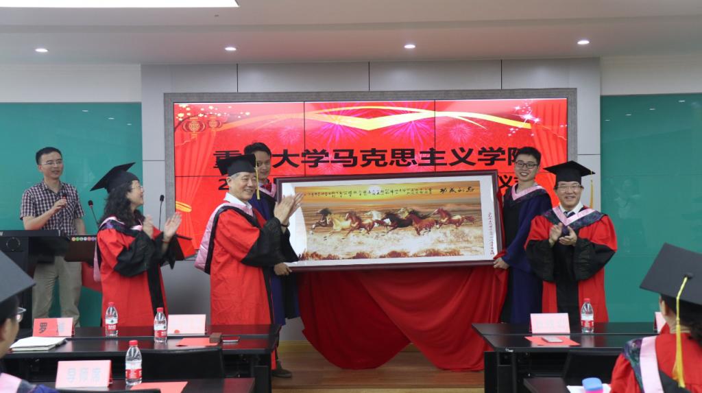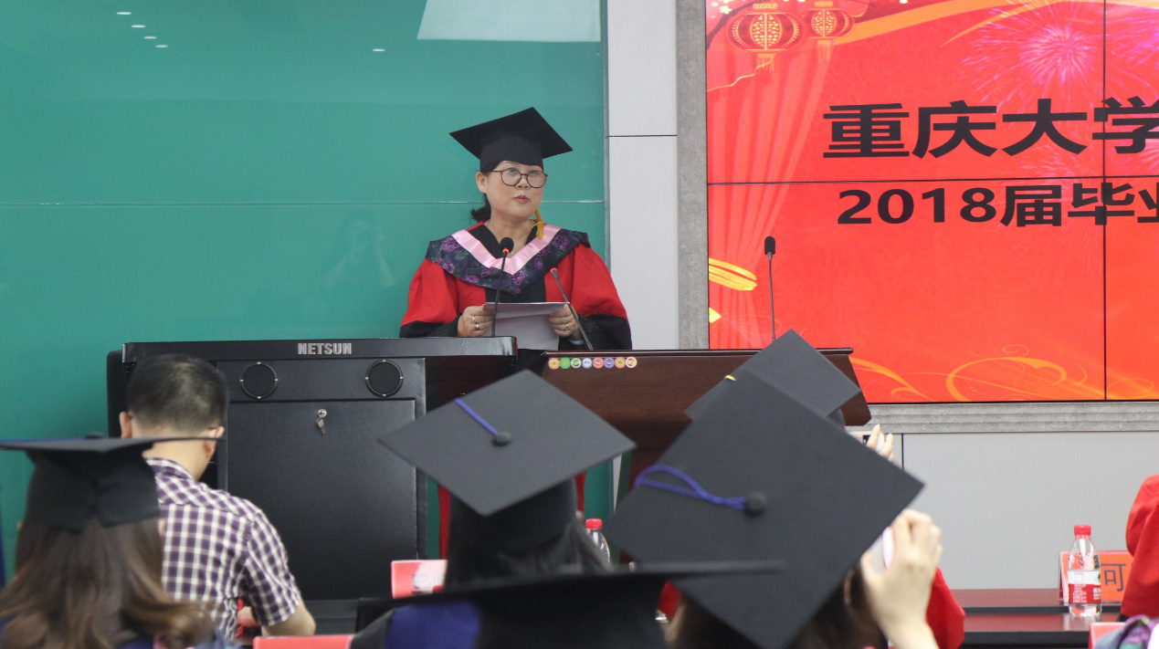 庞永红教授代表硕士生导师向毕业生致以衷心的祝贺。她希望即将走出校园的毕业生同学不仅要做一个有信仰的人,也要做一个善良的人,还要做一个认真有原则的人,更要做一个阳光乐观的人,要以良好的精神风貌向社会彰显“重大马院人”的责任和担当。