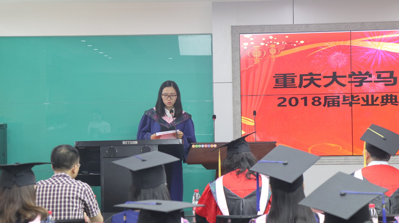 黄冰凤代表2018届硕士研究生在毕业典礼上发言,她回忆了在重大马院生活、学习、研究的点点滴滴。她难忘重大,难忘她的导师欧可平教授让她懂得了成长,收获了荣誉;她难忘身边的老师和同学,因为他们让她学会了心怀梦想、潜心学术;她难忘校训“耐劳苦、尚俭朴、勤学业、爱国家”,是重大的校训让她不忘初心,砥砺前行。
