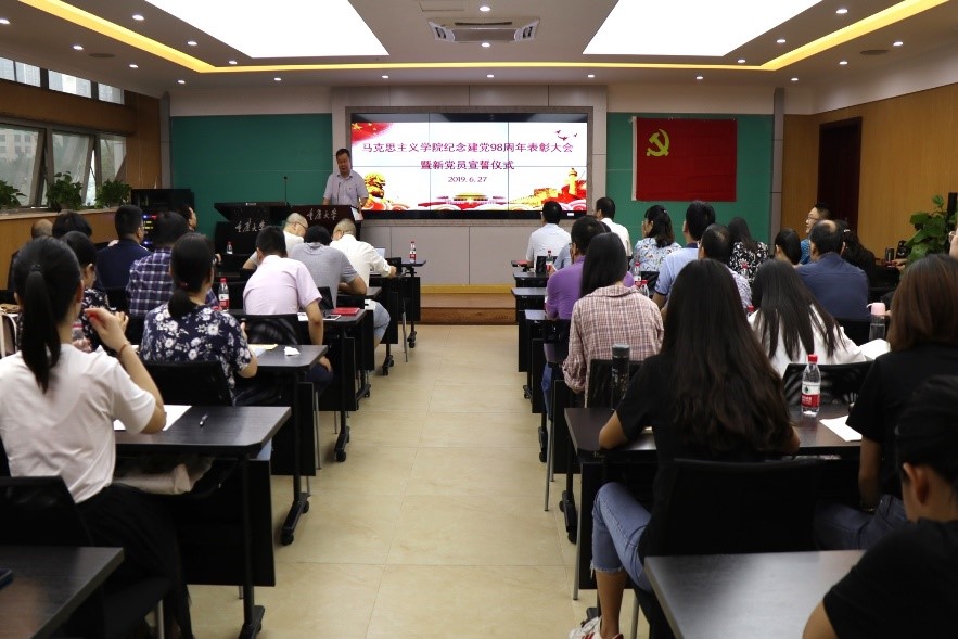 2019年6月27日,色花堂 在408会议室隆重举行纪念建党98周年表彰大会暨新党员宣誓仪式。色花堂 院长张邦辉、副院长徐鲲、吕进及学院全体师生党员参加了表彰大会,会议由学院党委副书记温健琳主持。