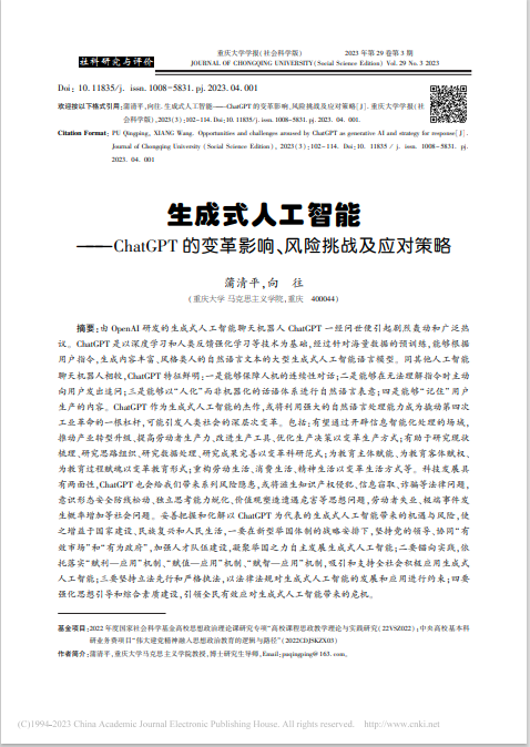 蒲清平教授在CSSCI核心期刊《重庆大学学报》(社会科学版)上发表论文《生成式人工智能——ChatGPT的变革影响、风险挑战及应对策略》