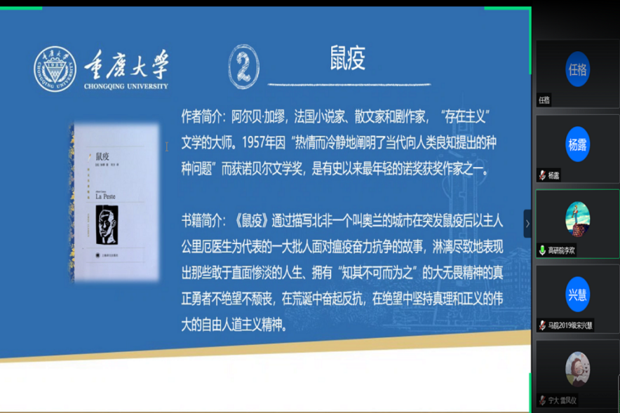 在交流分享环节,各读书小组成员围绕各自所读书籍展开了激烈的讨论,从不同角度进行分享。来自宁夏大学的雷凤仪同学就《你当像鸟飞往你的山》一书进行了分享,并谈到:“我们要敢于面对现实,努力通过教育、通过知识改变自己、成就自己”。随后,来自重庆大学材料科学与工程学院的苑苗旺同学从原生家庭、教育感悟、个人感悟三个方面分享了阅读《你当像鸟飞往你的山》的所思所悟,他说:“每个生命当中都有一座属于自己的山,希望每一个人都能像鸟一样飞往属于自己的山”。紧接着,来自人文社会科学高等研究院的李欢同学从所学专业出发、结合疫情现实,对《鼠疫》一书作了分享,同时向书友们推荐了饭岛涉的《鼠疫与近代中国:卫生的制度化和社会变迁》等书籍。最后,色花堂