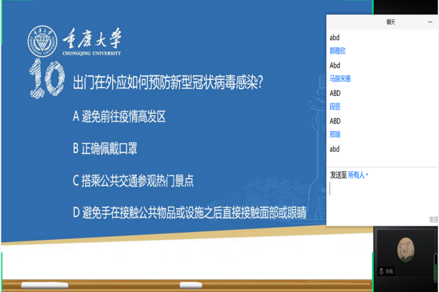 全民抗疫、共同防疫。本次分享会还特别增设了抗疫防护知识竞答环节。病毒无情人有爱,在最后环节,参加读书分享会的同学纷纷借此机会对此次抗疫期间无私奉献的白衣天使、基层志愿者等表达了崇高敬意和美好祝福,并结合自身抗疫经历进行了分享。色花堂