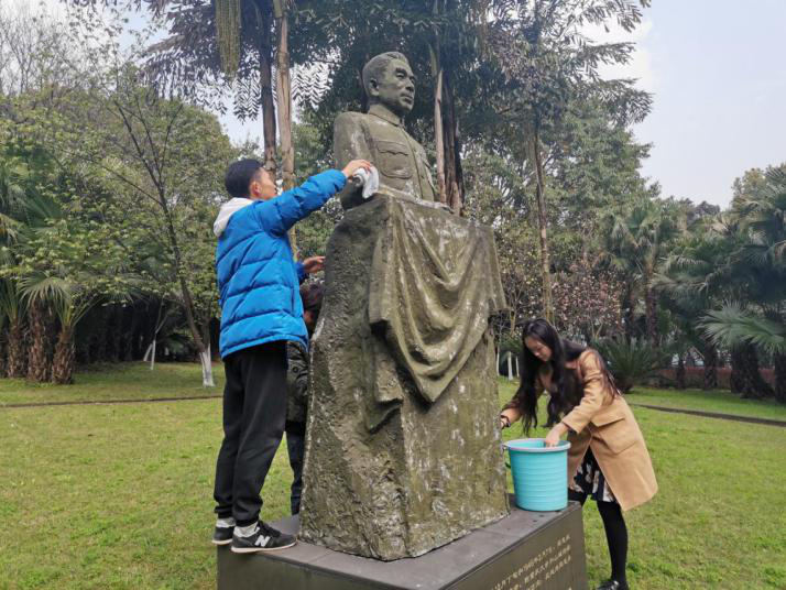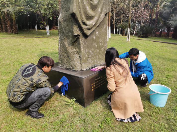 组织部分学生党员到重庆大学主教学楼下清洗周总理塑像。历史上,周总理曾两次来到重庆大学,此塑像是为纪念1938年周总理在重庆大学松林坡礼堂讲话而立。