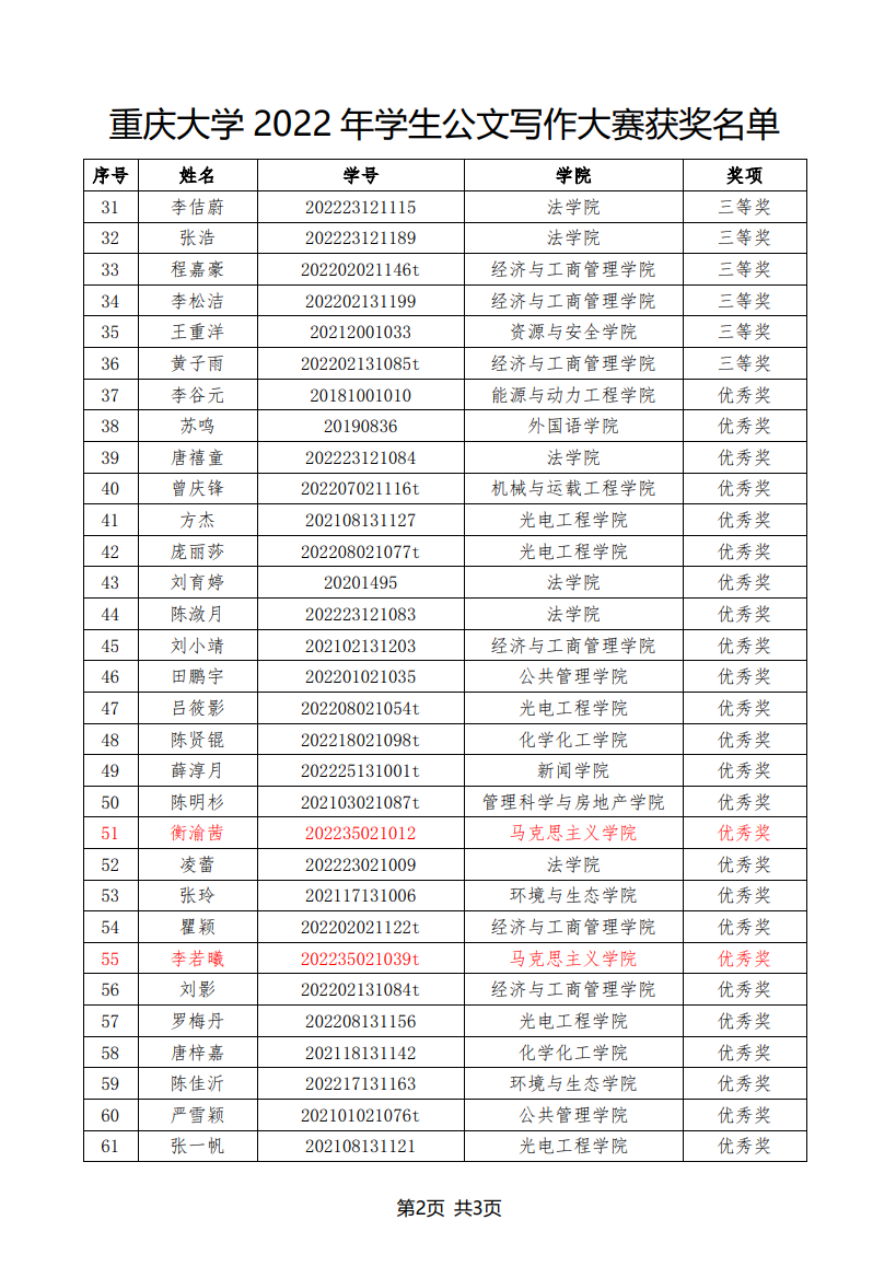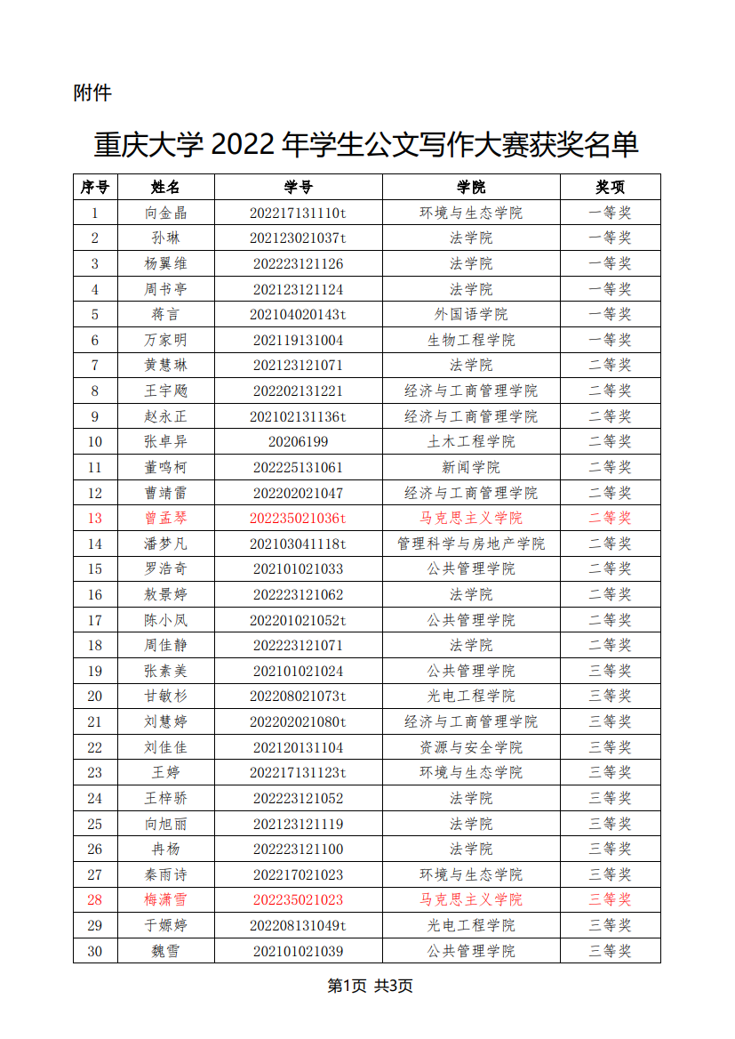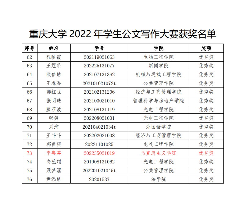 在2022年11月至12月举办的“志公博学,明文定理”重庆大学2022年公文写作大赛中,色花堂 曾孟琴等5名研究生获奖,获奖名单如下: