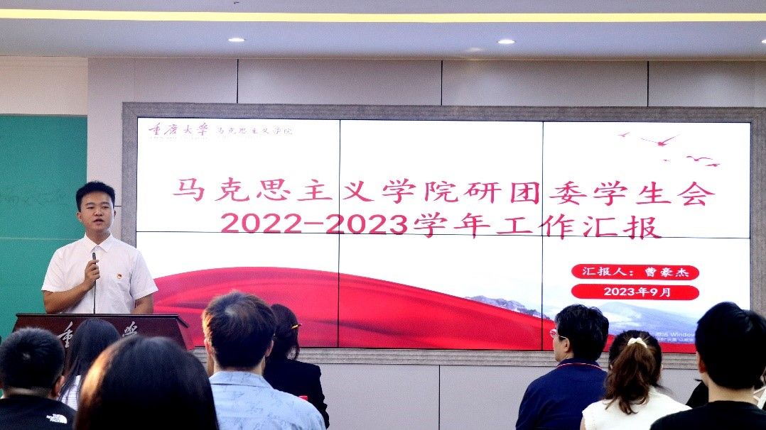研分会负责人曹豪杰作2022-2023学年工作汇报。他从研团委学生会概况、组织建设情况、学生活动总结、获奖情况四个方面总结了上一学年的工作情况。在上一学年中,学院研团委学生会共获团体奖项十一项,个人及团体奖项数十项,取得了优异成绩,希望新一届研团委学生会全体成员能够继续发扬往届的优良传统,把新一学年的工作做出特色、做出风格,勉励大家勇毅笃行向未来,踵事增华再出发。
