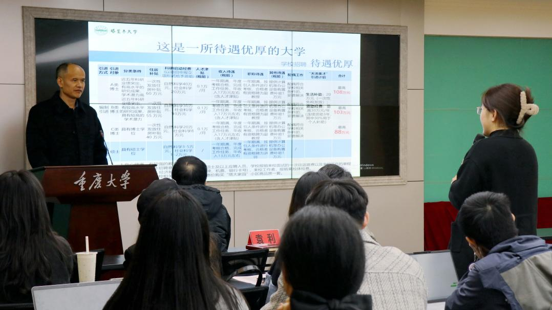 工作建设中的支持与帮助,他以“三个不平凡”为关键词介绍了塔里木大学的学校情况,并对人才引进基本条件及待遇进行详细解读。在讨论互动环节,针对同学们提出的疑问他耐心地予以解答。