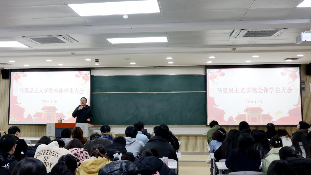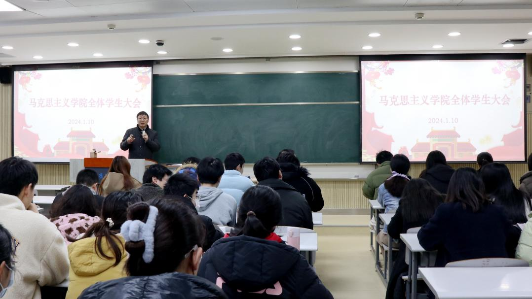 在研究生院608教室召开全体学生大会,会议由学院党委副书记袁利主持,副院长吕进、徐鲲、辅导员张丹、班主任杨柠聪、李家丽和彭蓉以及全体博士生、硕士生、本科生参加此次大会。