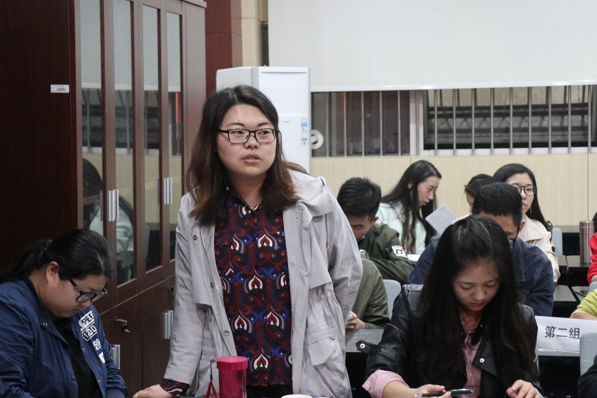 活动伊始,读书会进入分享讨论环节,马尚明同学就“中国道路为什么是对的”代表第一小组作分享,他从中国道路的内涵、坚持中国道路的原因、中国道路的未来展望三个方面进行了阐述 。分享结束后,他提出“中国道路的标准和动力是什么?”这一问题和大家作交流。第二小组代表何丽玲同学则以十九大提出的社会主义新矛盾为题作分享,最后就 “新时代下人们群众需求的特点以及马克思主义理论专业学生可以做哪些努力?”这一问题与大家进行交流。第三组代表韩梦馨同学从“新时代、新内涵、新路径、新思想”四方面为大家作分享,根据分享内容抛出“党的建设为何是关键?”这一话题与大家讨论。接下来是第四组卫婷婷同学为大家分享“四个伟大”,与大家交流其内在逻辑。最后,第五组代表马小帅同学从新思想、新时代两个角度进行分享。每组分享结束后限五人进行抢答交流。同学们积极参与,经过四轮激烈角逐,第二小组同学拔得头筹,小组成员均获得一份礼品。
