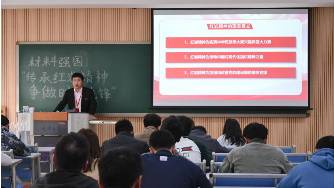 红岩宣讲团受邀参加材料科学与工程学院在B区第二综合楼504会议室举办的“材料强国|传承红岩精神,争做时代先锋”主题党团活动。红岩宣讲团讲师杨林炎、曾孟琴、谢婉芳担任主讲人,材料科学与工程学院部分研究生参加此次活动。