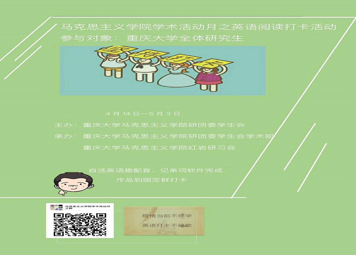 此次英语阅读打卡活动利用网络资源、采用有趣的外语在线学习途径,即以外文期刊文献阅读、英语趣配音、记忆单词小程序等为主成立英语阅读打卡圈,吸引了来自重庆大学公共管理学院、土木工程学院、汽车工程学院、色花堂 等三十余名同学参与其中。
