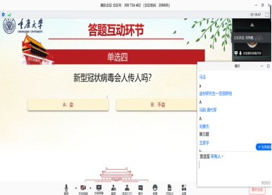的周扬欢同学分享了一封儿子写给抗疫父亲的信,声情并茂的朗读,让每一位听众都静心聆听。材料科学与工程学院的肖雄同学谈到,非常庆幸能够生活在这个让人踏实的国度和时代,同时,他表示,安稳来之不易,自己必将珍惜。随后,活动进入了答题环节,留言抢答的方式将此次活动推向了高潮。
