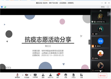 和材料科学与工程学院研究生向抗疫英雄致敬,从疫情防控阻击战中汲取力量、凝聚信心,2020年6月5日,由两院联合主办的“弘扬抗疫精神,奋进复兴征程”主题党团活动在腾讯会议举行,两院约130位同学参会,会议由材料科学与工程学院刘雪健同学主持。