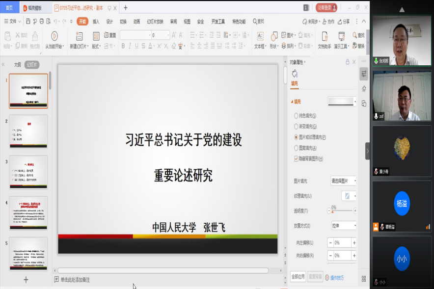 张世飞教授从“为什么,是什么,怎么做”三个方面,对习近平总书记关于党的建设重要论述进行了深刻解析。张教授首先分析了党建思想的理论意义、历史意义、实践意义,随后以三个案例分析面向新时代中国共产党如何推进自我革命和社会革命,在解读“一个中心、两个重点、三个板块、四大问题、十八个专题”基础上厘清了党建的理论源头、重要基础和直接来源,从历史根据上分析了建党后特别是改革开放以来党的建设的经验总结。最后,张教授讲到,必须以党的政治建设为统领、以党的思想建设为根本,大力加强党的组织建设、加强党的作风建设、加强党的纪律建设,把党建设成为始终走在时代前列、人民衷心拥护、勇于自我革命、经得起各种风浪考验、朝气蓬勃的马克思主义执政党。
