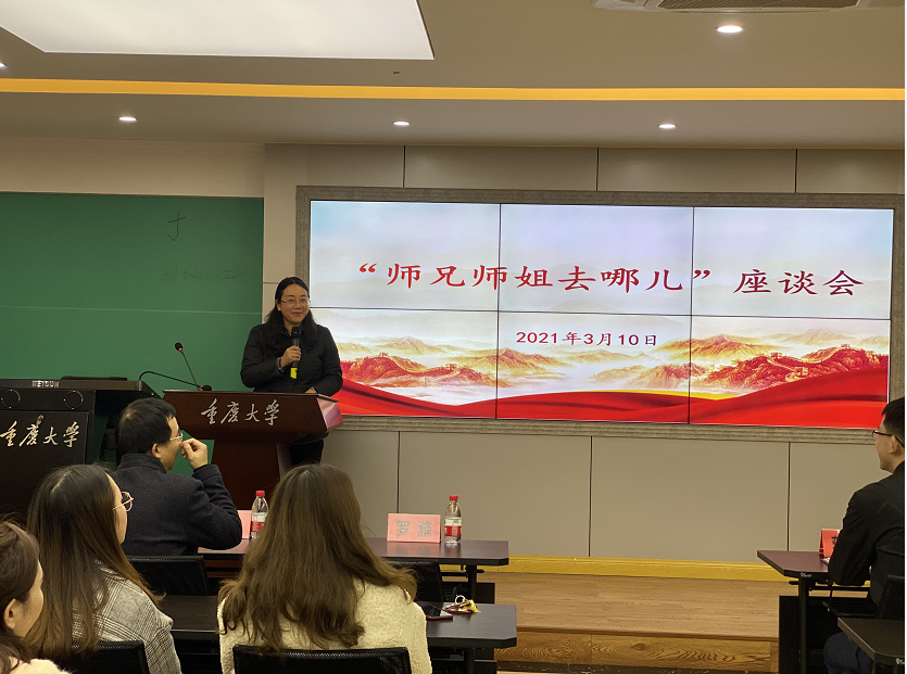 2021年3月11日下午,学院在408教室举办“师兄师姐去哪儿”座谈会,学院邀请陈妍西、何丽玲、尚杨、蒋弦四位毕业生向在校同学分享就业、求学等经验,学院党委书记罗滌,党委副书记温健琳参加座谈。