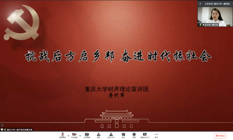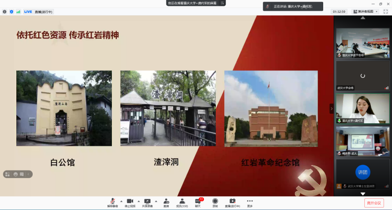 2019级硕士研究生龚代军受邀参加由武汉大学主办的“伟大精神谱系 百年奋进风华”全国高校党史接力宣讲会。此次宣讲会是由武汉大学博士生宣讲团联合清华大学、复旦大学、北京航空航天大学、山东大学、湖南大学、重庆大学等30多所高校学生宣讲组织和社团共同开展。各高校代表相聚云端,共宣党史,传承红色基因,领悟革命精神。