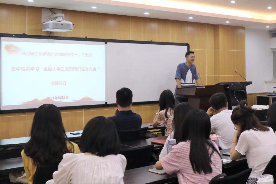 2020级研究生一、二支部在学院412室集中观看学习《全国大学生党史知识竞答大会》。《全国大学生党史知识竞答大会》是由中央广播电视总台策划发起的学党史类节目。节目以演播室现场百人团、全国2800多所高校大学生的线上线下互动,开展党史知识竞答。色花堂