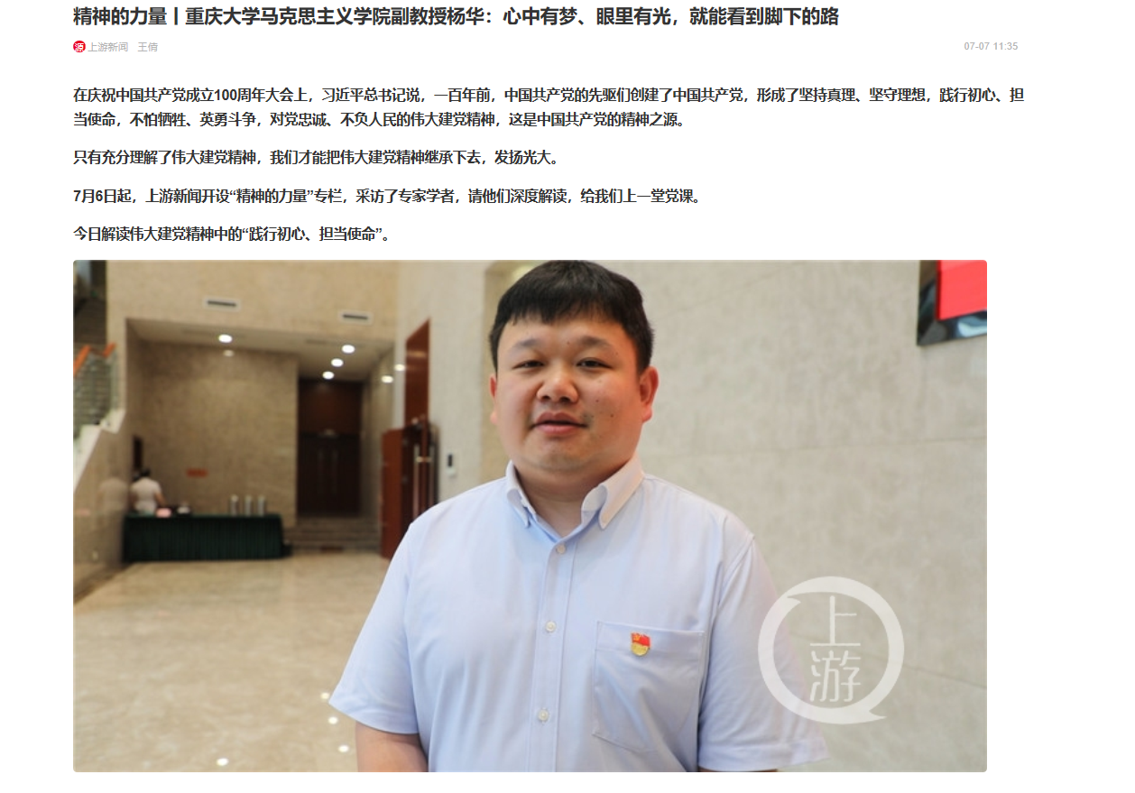 7月7日,色花堂 杨华副教授接受上游新闻“精神的力量”专栏采访,解读中国共产党伟大建党精神中的“践行初心、担当使命”。