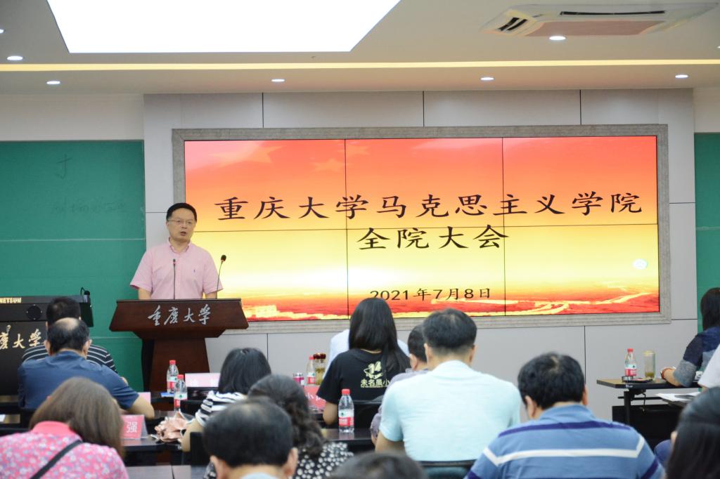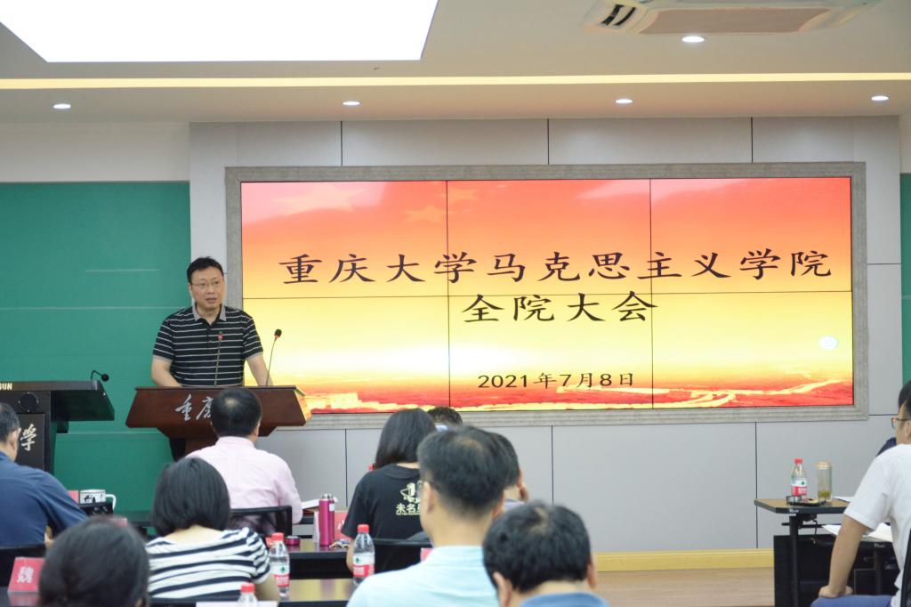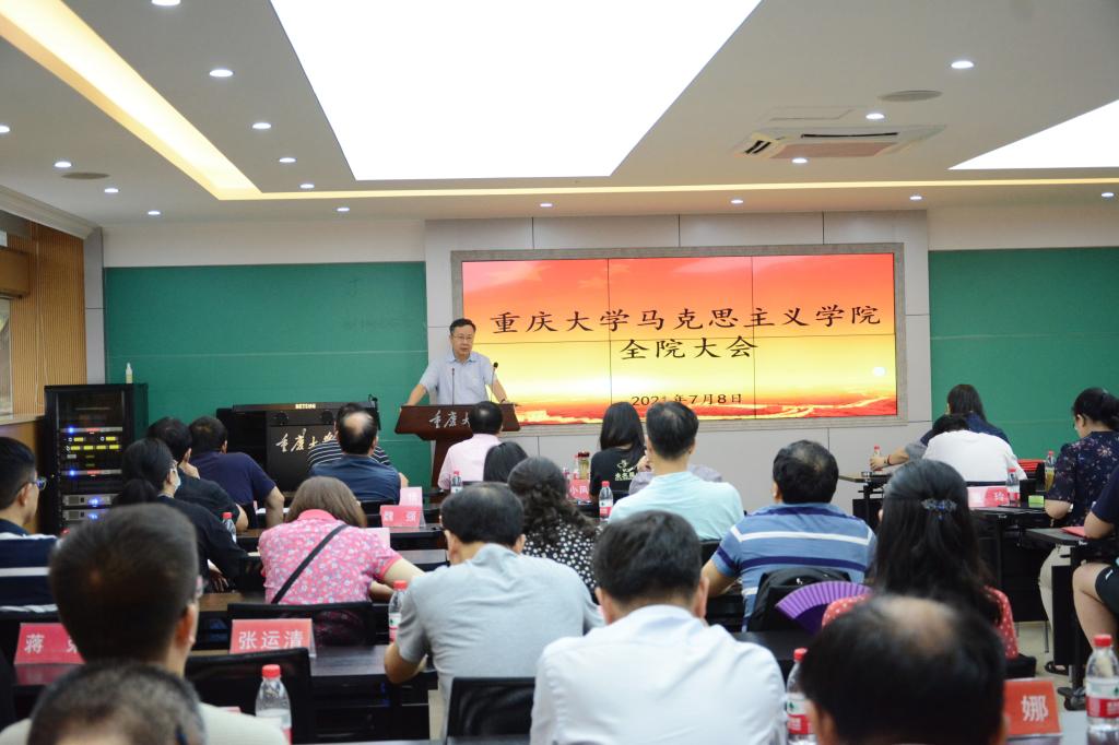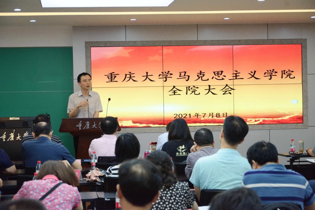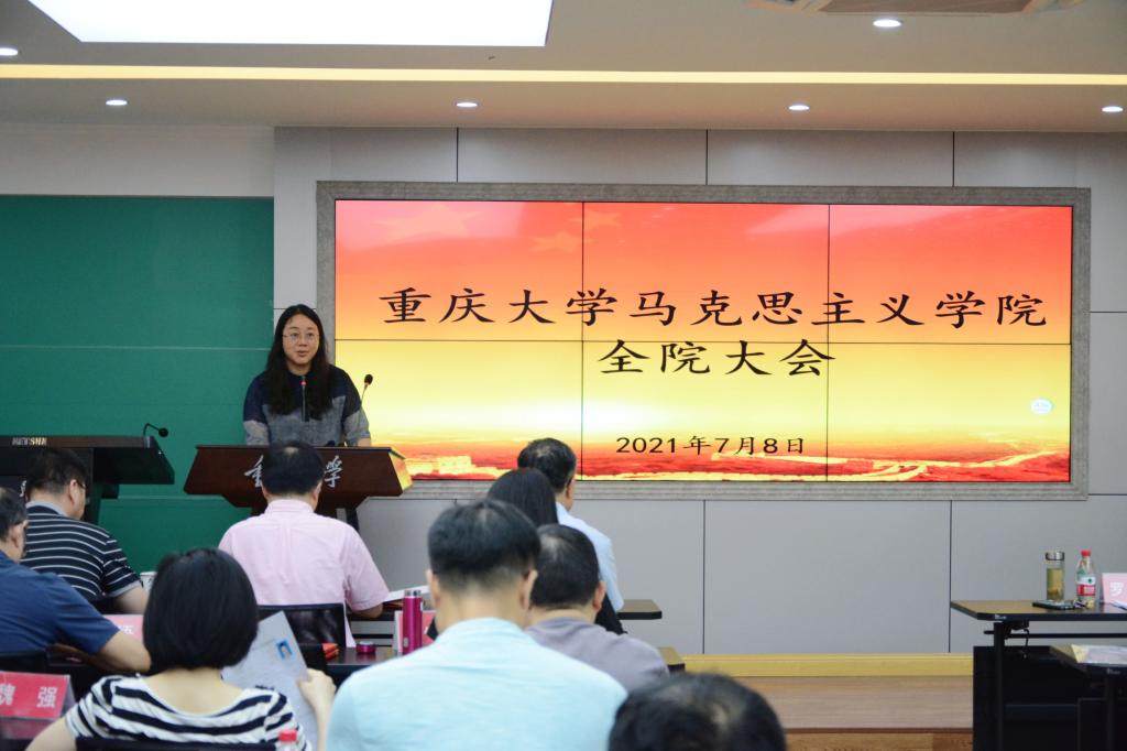 党委书记罗滌组织了相关重要文件的政治学习,并结合学院工作进行了布置。她首先带领与会教职工学习了习近平总书记在庆祝中国共产党成立100周年大会上的重要讲话精神,要求各位老师深入领会习近平总书记“七一”重要讲话的重大意义与丰富内涵,真学实用,指导具体工作,以实际行动增强“四个意识”,坚定“四个自信”,做到“两个维护”。紧接着,她带领与会教职工学习了习近平总书记给《文史哲》编辑部全体编辑人员重要回信精神,要求各位老师要深入学习领会总书记回信的精神实质,紧密结合学院实际,不折不扣抓好贯彻落实。随后,她带领与会教职工学习了《重庆大学开展师德专题教育工作方案》重点内容,就组织深入学习习近平总书记关于师德师风的重要论述、强化教师“四史”学习教育等相关工作进行了部署安排。最后,罗滌书记对学院党史学习教育第一阶段工作进行了通报,她从党史教育活动的开展情况、特色做法、学习收获等方面进行了总结,她指出学院党委将按照教育部党史学习教育推进会精神和巡回指导组要求,持续深入推进党史学习,推动办实事机制落地落实,努力把党史学习教育成果转化为推动改革发展的实际成效。