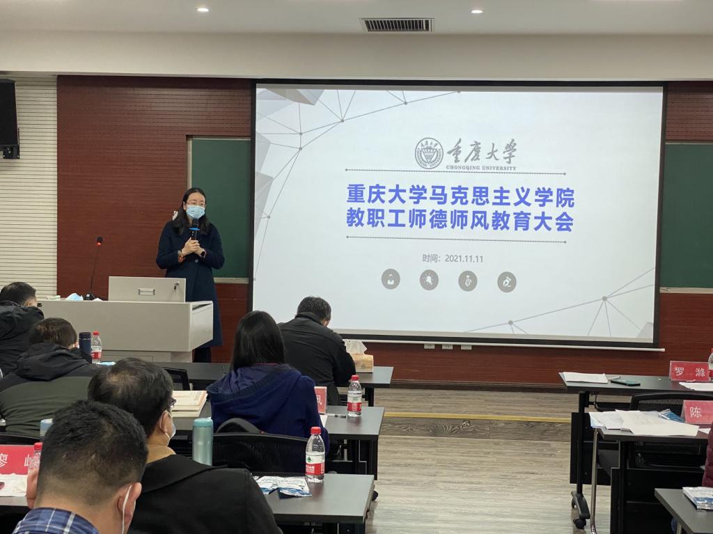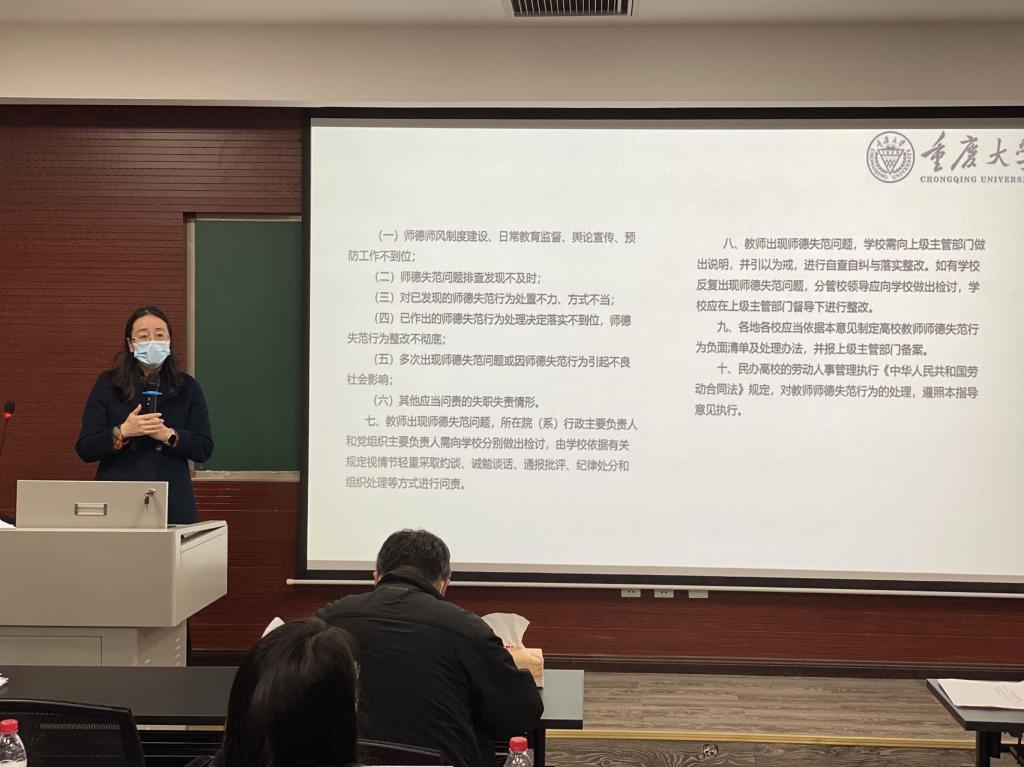 随后,罗滌带领大家进行了警示案例的学习,学习了《重庆大学教师师德失范行为负面清单》,她要求与会教师深刻领会此次师德师风教育大会精神,全体教职工要把师德师风学习常态化,将师德师风的相关学习心得融入日常生活,将学习内容内化于心、外化于形,以实际行动担负起为党育人、为国育才的使命,做好学生的引路人。