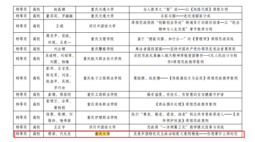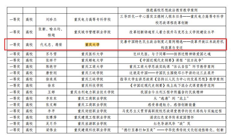 蒋荣、代礼忠老师的《发展中国特色民主政治制度之案例精选——你想要什么样的民主?》《完善中国特色民主政治制度之案例精选——改革开放以来政府机构改革与变迁》分别获得优秀案例特等奖与一等奖,徐鲲老师的《重庆大学多举措提升思想政治理论课教育教学质量》及李扬老师的《数学“坐标轴”与哲学“人的本质”》获得优秀案例二等奖,王小凤老师的《<思想道德与法治>课程中“以赛促学、以赛促行”实践教学模 式的应用与探索》及张运清老师的《习近平乡村振兴战略》获得优秀案例三等奖。