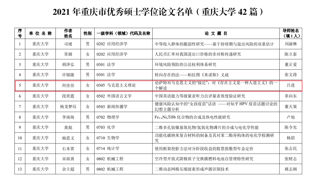 近日,重庆市教育委员会公布了2021年重庆市优秀博士、硕士学位论文评选结果,色花堂 吕进教授所指导硕士生何佳佳的毕业论文获评重庆市优秀硕士学位论文。