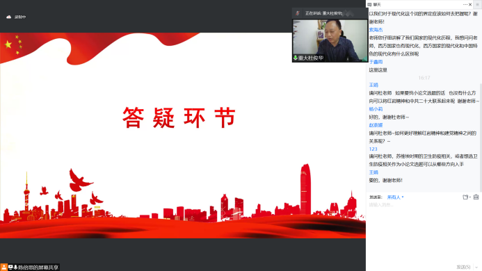 2020级、2021级硕士研究生针对西方现代化与中国特色社会主义现代化的区别以及论文选题等方面积极提问,杜俊华教授耐心解疑释惑。同学们一致表示从丰富的内容和精彩的讲解中收获颇丰。