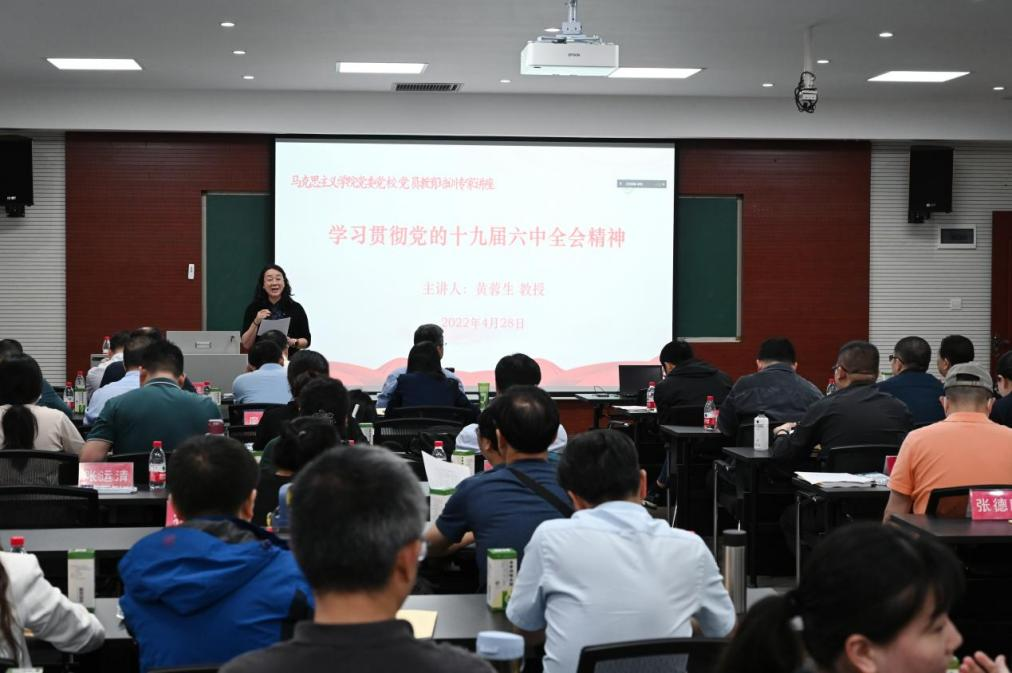 黄蓉生教授从党的十九届六中全会的深刻内涵及其融入高校思政课教育教学体系两大方面进行了详细的讲解。黄教授首先对党的十九届六中全会作了简要概述,具体分析了总结党的百年奋斗的重大成就和历史经验的“三个需要”。紧接着,她围绕“党的十九届六中全会精神融入高校思政课教育教学体系若干思考”向参会师生提出了三点要求:一是要在深入学习深刻理解党的十九届六中全会精神成果上下功夫。重在牢记“中国共产党是什么、要干什么”这个根本问题,看清楚“中国共产党过去为什么能够成功”、弄明白“未来怎样才能继续成功”这一基本道理;二是要在讲透彻讲清楚党的十九届六中全会精神成果上花力气。将党的十九届六中全会精神融入高校思政课教育教学体系,使其进教材、进课堂、进头脑;三是要在依托学科专业研究党的十九届六中全会精神成果上做文章。她强调要加强对党的十九届六中全会精神和《决议》中马克思主义唯物辩证法、中国共产党正确党史观、历史观的研究,若干新思想、新论断、新观点、新理论的阐释,推出一批有学术水平、有影响力的高质量研究成果和咨政报告,为思政课的改革创新添加生生不息的动力。