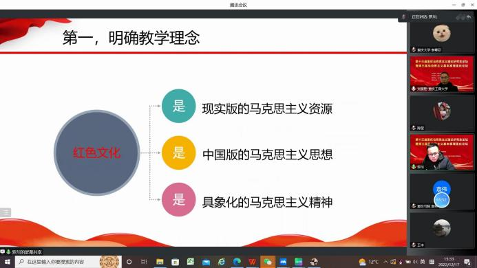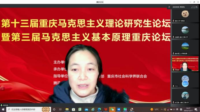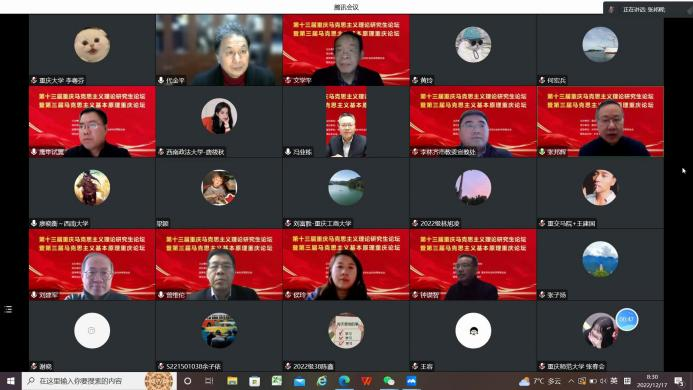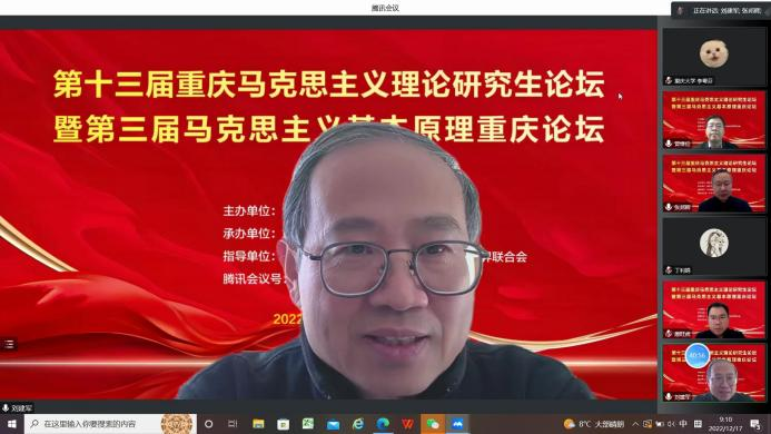 2022年12月17日,第三届马克思主义基本原理重庆论坛在腾讯会议平台顺利举办。本次论坛由重庆市教育委员会主办,重庆大学承办,中共重庆市委宣传部、重庆市社会科学界联合会为指导单位。论坛邀请了中国人民大学、西南大学、西南政法大学、重庆邮电大学、重庆师范大学等高校的17名马克思主义基本原理学者作主题报告,来自重庆市10余所高校的240余名师生参加此次论坛。