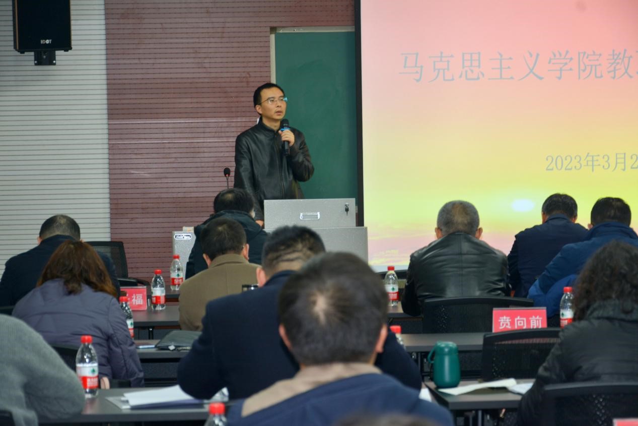 张邦辉院长首先传达了王树新校长在2023年春季学期开学干部大会的上讲话精神,要求全体教职工在新的学期,要深刻学习领会党的二十大精神,根据学校安排部署高质量推进中国特色世界一流大学建设。张院长布置了上好“开学第一堂思政课”工作,各教研室要根据通知要求组织开展好专题教学集体备课会,提升课堂教学质量。张院长强调要促进思政教师实地观摩学习交流,加强教师培训,提升思政课教学质量。他强调要进一步加强优秀人才引进工作,人才引进是今年学院重中之重的工作。