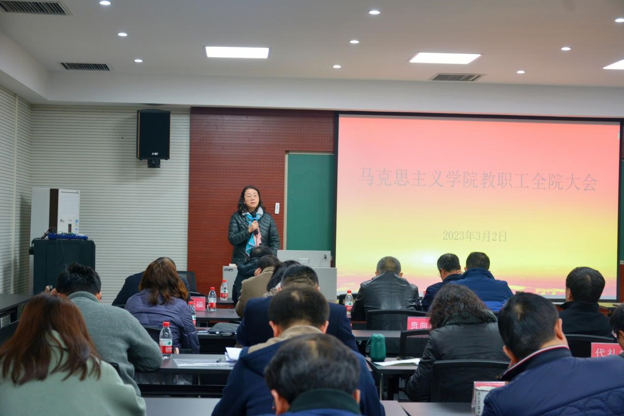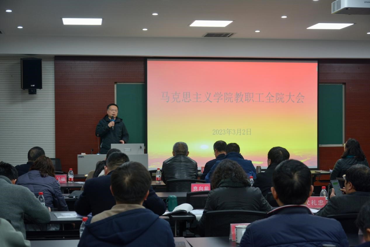 在学院414会议室召开2023年春季第一次教职工全院大会,会议由党委书记罗滌主持,学院领导班子及马院全体教职工参加会议。