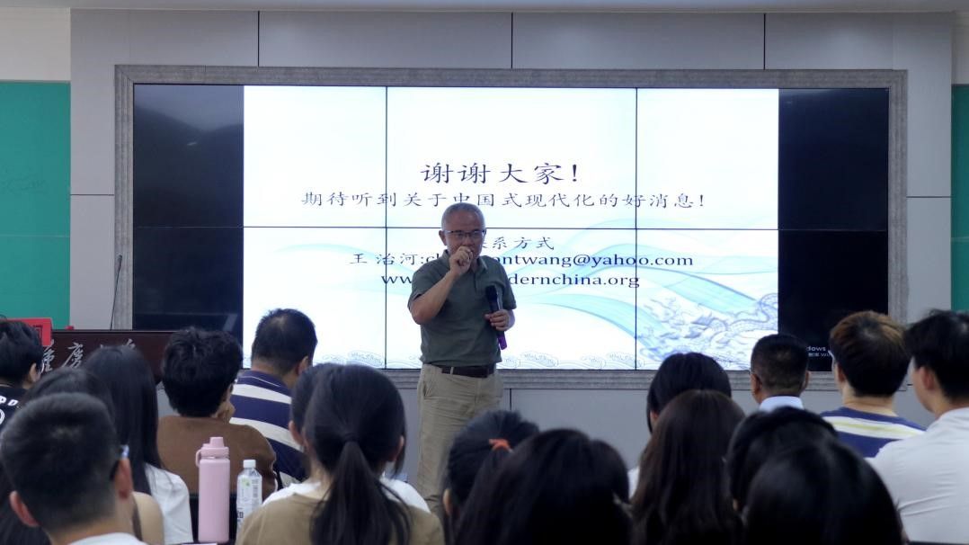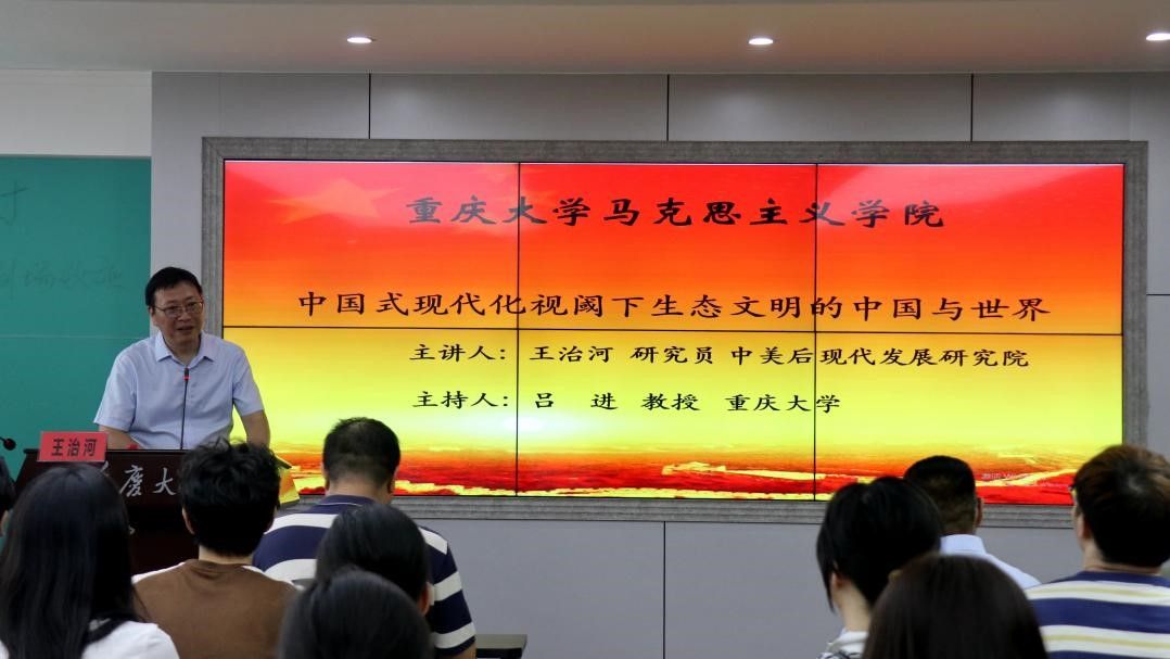 学院党委书记陈科对王治河研究员的到来表示热烈欢迎并对其学术成就做了相关介绍。随后,王治河研究员以“走下神坛的西式现代化”入题,分析了当今国际社会中西式现代化面临的困境及其哲学原理,从而提出生态文明亟需中国式现代化的中心论点。紧接着他从中国式现代化何以推进生态文明、中国式现代化与建设性后现代主义的深度妙合以及如何活出现代化三个方面展开详细论述。
