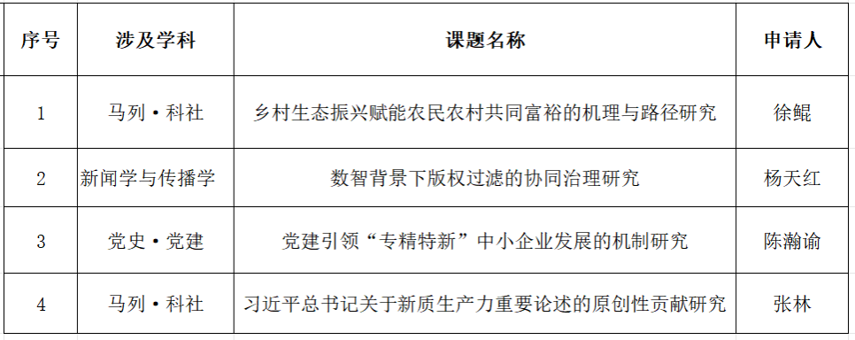 2024年10月15日,全国哲学社会科学工作办公室正式发布了2024年度国家社会科学基金年度项目立项名单。色花堂 立项4项,其中徐鲲教授、杨天红副教授获2024年国家社会科学基金一般项目立项,陈瀚谕副教授、张林博士获2024年国家社会科学基金青年项目立项。