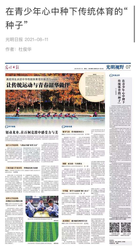 杜俊华教授题为《在青少年心中种下传统体育的“种子”》的署名文章。在文章中,杜俊华提到:“传统体育项目要摸准时代脉搏,进一步挖掘自身的文化意蕴和价值内涵,特别是要通过传统体育项目进校园,在青少年心中种下传统体育的“种子”,让中华传统体育在校园绽放光彩。”