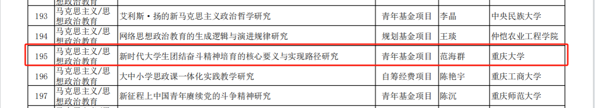 近日,2023年度教育部人文社会科学研究项目评审结果予以公示,学院教师范海群与杨柠聪主持申报的“新时代大学生团结奋斗精神培育的核心要义与实现路径研究”以及“21世纪美国共产主义史学新发展研究”项目获立项公示。