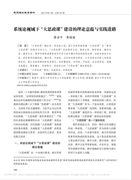蒲清平教授在《思想理论教育导刊》上发表论文《系统论视域下“大思政课”建设的理论意蕴与实践进路》