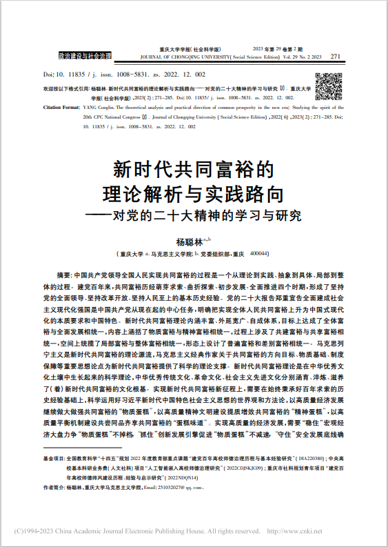 杨聪林博士在《重庆大学学报》(社会科学版)上发表论文《新时代共同富裕的理论解析与实践路向——对党的二十大精神的学习与研究》