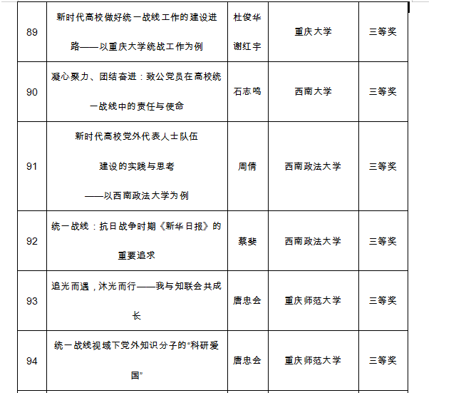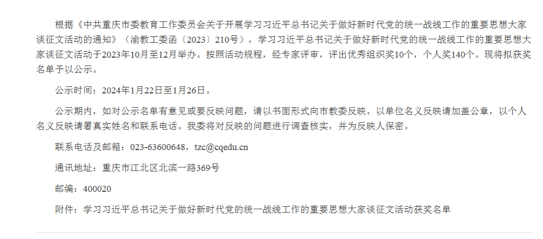 根据《中共重庆市委教育工作委员会关于开展学习习近平总书记关于做好新时代党的统一战线工作的重要思想大家谈征文活动的通知》(渝教工委函〔2023〕210号),学习习近平总书记关于做好新时代党的统一战线工作的重要思想大家谈征文活动于2023年10月至12月举办。按照活动规程,经专家评审,谢红宇同学所写的《新时代高校做好统一战线工作的建设进路——以重庆大学统战工作为例》获得重庆市学习习近平总书记关于做好新时代党的统一战线工作的重要思想大家谈征文活动三等奖。